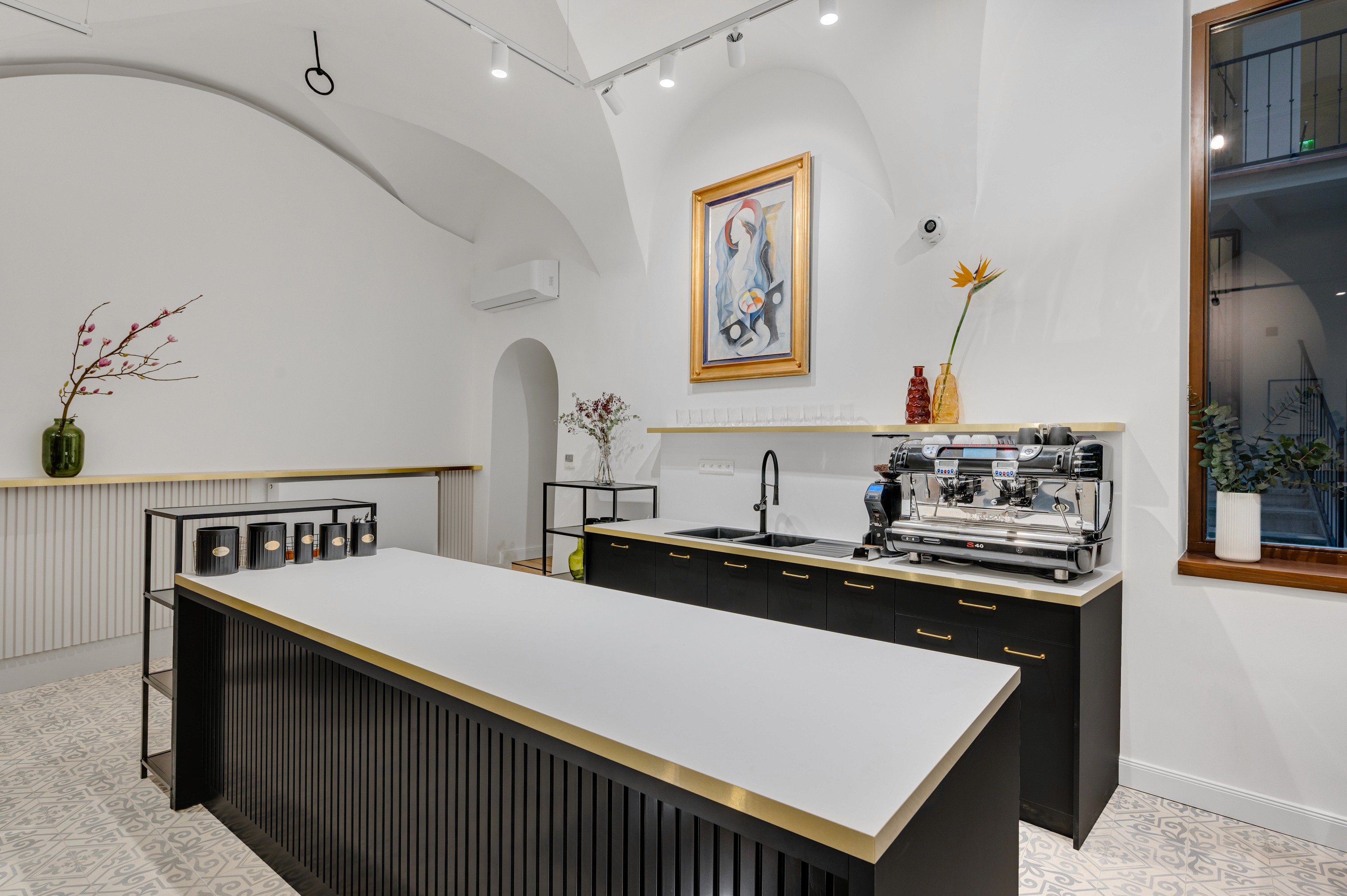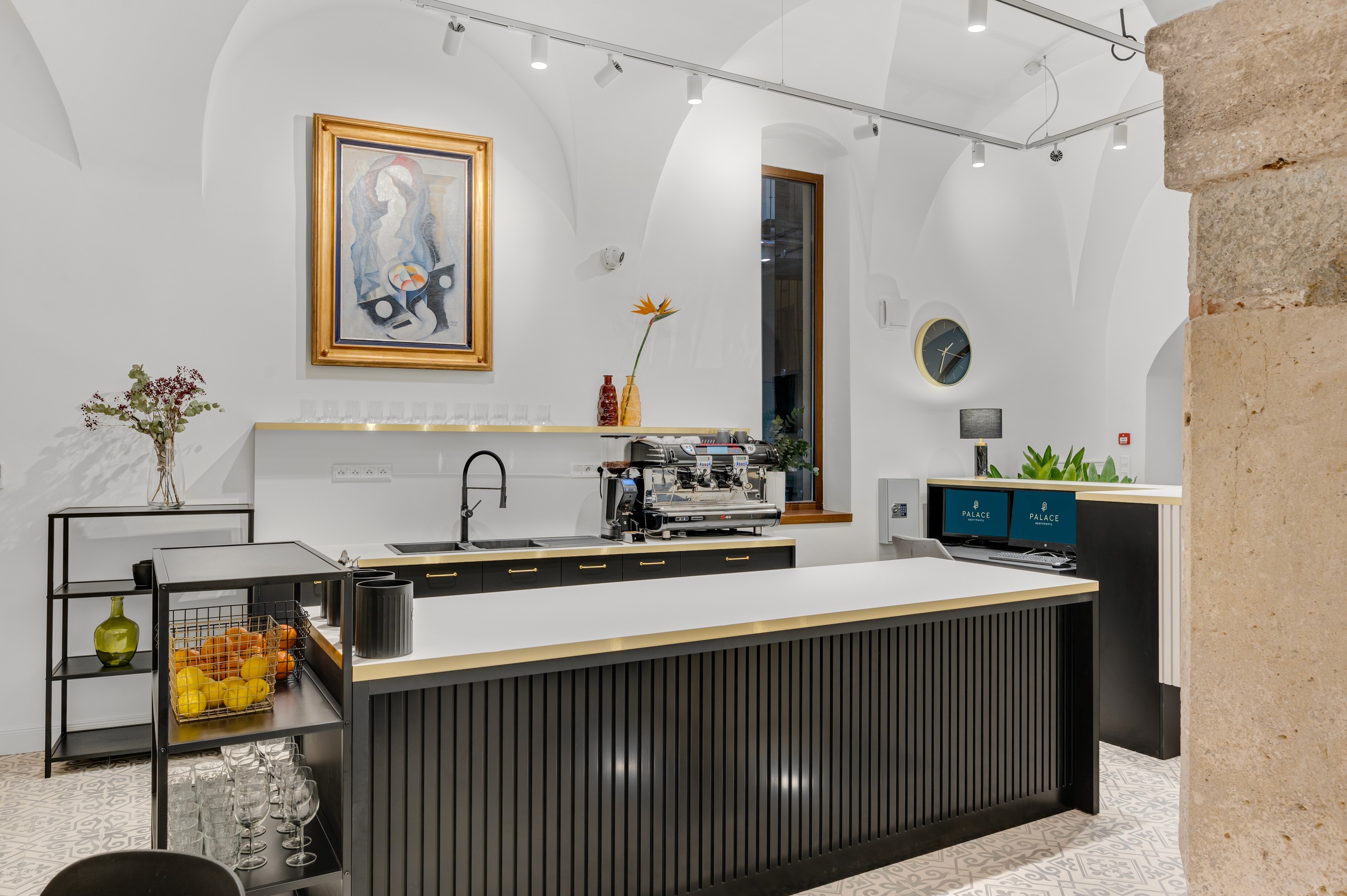 Recepcia apartmánového hotela spája nadčasový dizajn s pohostinnosťou. Elegantný pult, jemné osvetlenie a umelecké detaily vytvárajú sofistikovanú atmosféru.